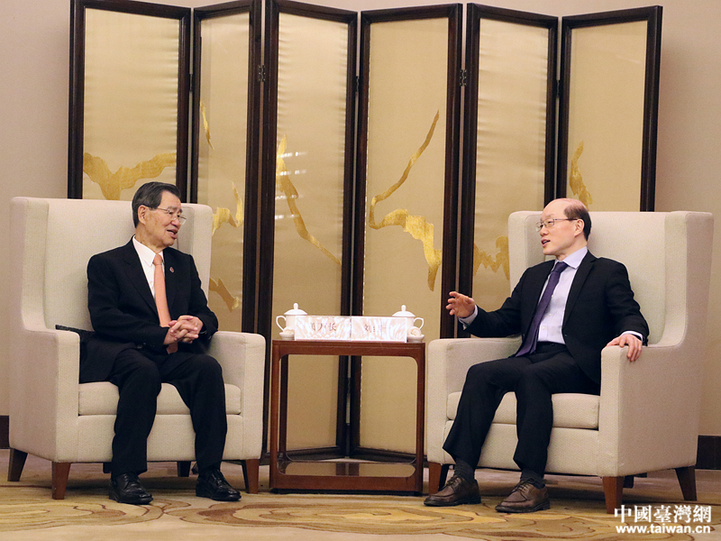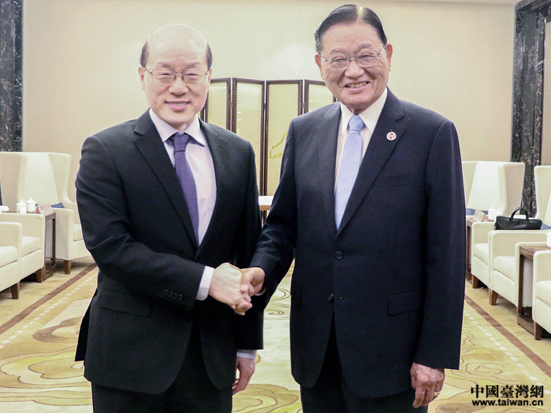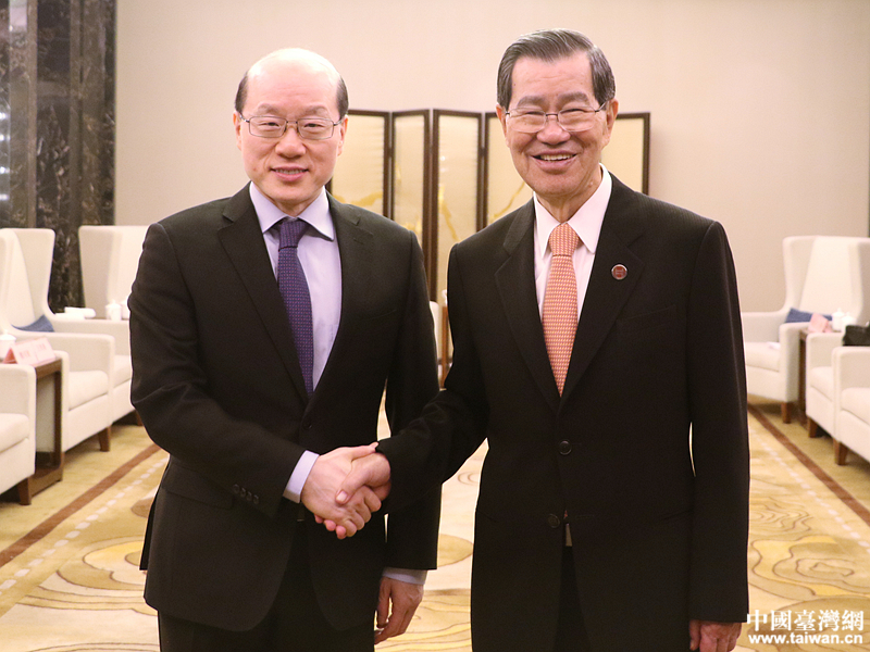 中共中央台办、国务院台办主任刘结一会见两岸企业家峰会台湾方面副理事长江丙坤。(中国台湾网 李宁 摄)