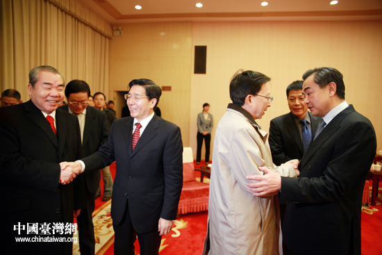 17日晚,广西壮族自治区党委书记郭声琨和中台办、国台办主任王毅一起,会见来桂林参加第九届两岸关系研讨会的台湾中华文化总会会长刘兆玄等嘉宾。(中国台湾网 钟宝华 摄)