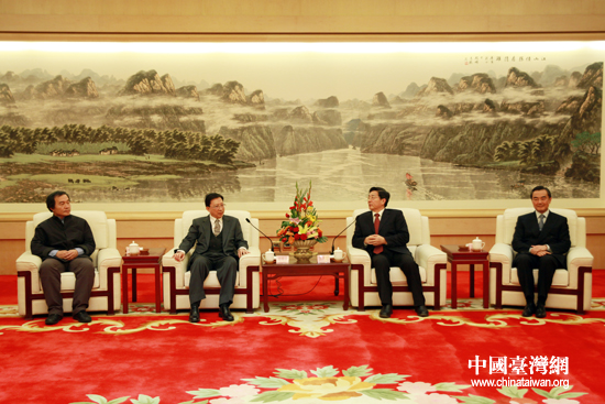 17日晚,广西壮族自治区党委书记郭声琨(右二)和中台办、国台办主任王毅(右一)一起,会见来桂林参加第九届两岸关系研讨会的台湾中华文化总会会长刘兆玄(左二)等嘉宾。(中国台湾网 钟宝华 摄)